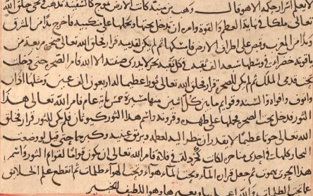 First line reads: Laa ya’lam israar hikmah al-ahooqaal wa hab min munabbah (bold for emphasis) kaanat al-ard mooj? Hooj? Kassa’bibnah mud-hibu kaa halq allah