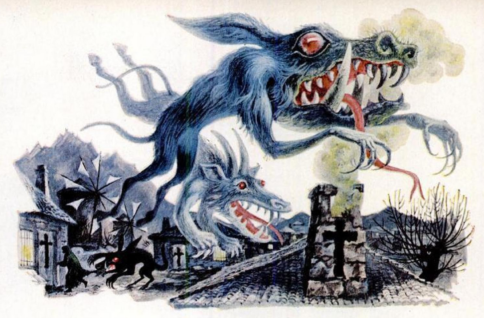 Gerbert de Montreuil’s continuation of Perceval borrows from the Perlesvaus. We are not given a description of the Beast, but are instead told that it is grant a merveille (“marvelously large”). The Beast’s young are barking and yelping from within its belly, and when it comes up to the cross in the glade, they emerge violently, breaking it in two pieces. The young then devour their mother before going mad, turning on and killing each other. This bloody episode has a far more mundane meaning – Perceval is told that the loud, murderous whelps are the people who disturb church services by talking loudly and complaining about hunger!