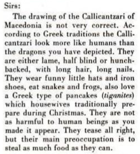 What better than to mention a seasonal being? Below are a depiction of the Callicantzari by James Lewicki for the December 19, 1955 issue of LIFE Magazine… and a correction sent by Nicholas R. of New Haven, CT in the January 9, 1956 issue.