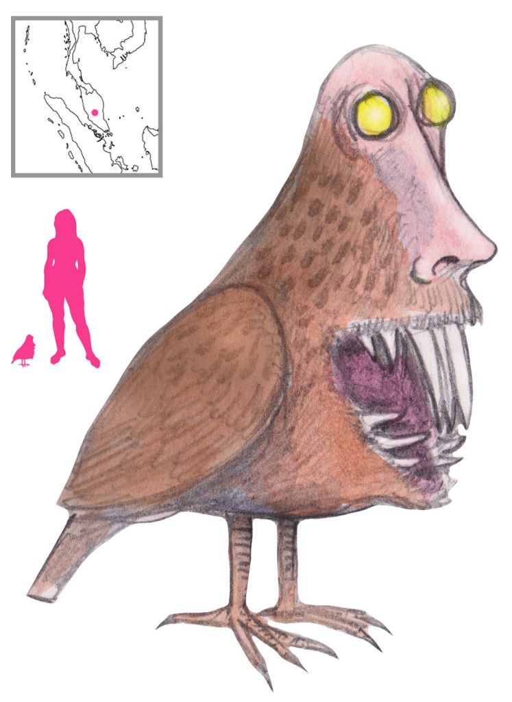 Another bird spirit lives deep in the jungle and visits villages at night. It makes a sound – pok… pok… – which children are not allowed to repeat. If they do the spirit enters the house, prevents them from sleeping, and makes them cry.