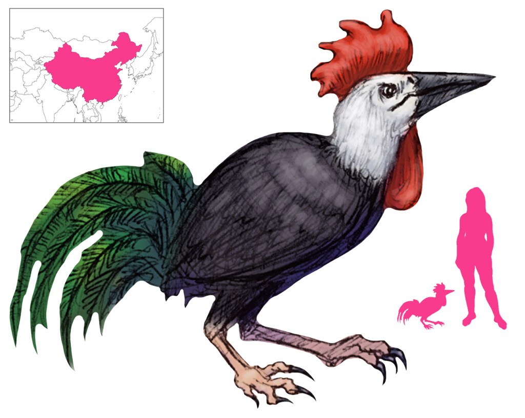 “Where does the Qi-magpie dwell?” asks the Questions of Heaven. According to the Shan Hai Jing it makes its home on North Shouting Mountain. It looks like a chicken with a white head, the feet of a rat, and the claws of a tiger. It is a man-eater.