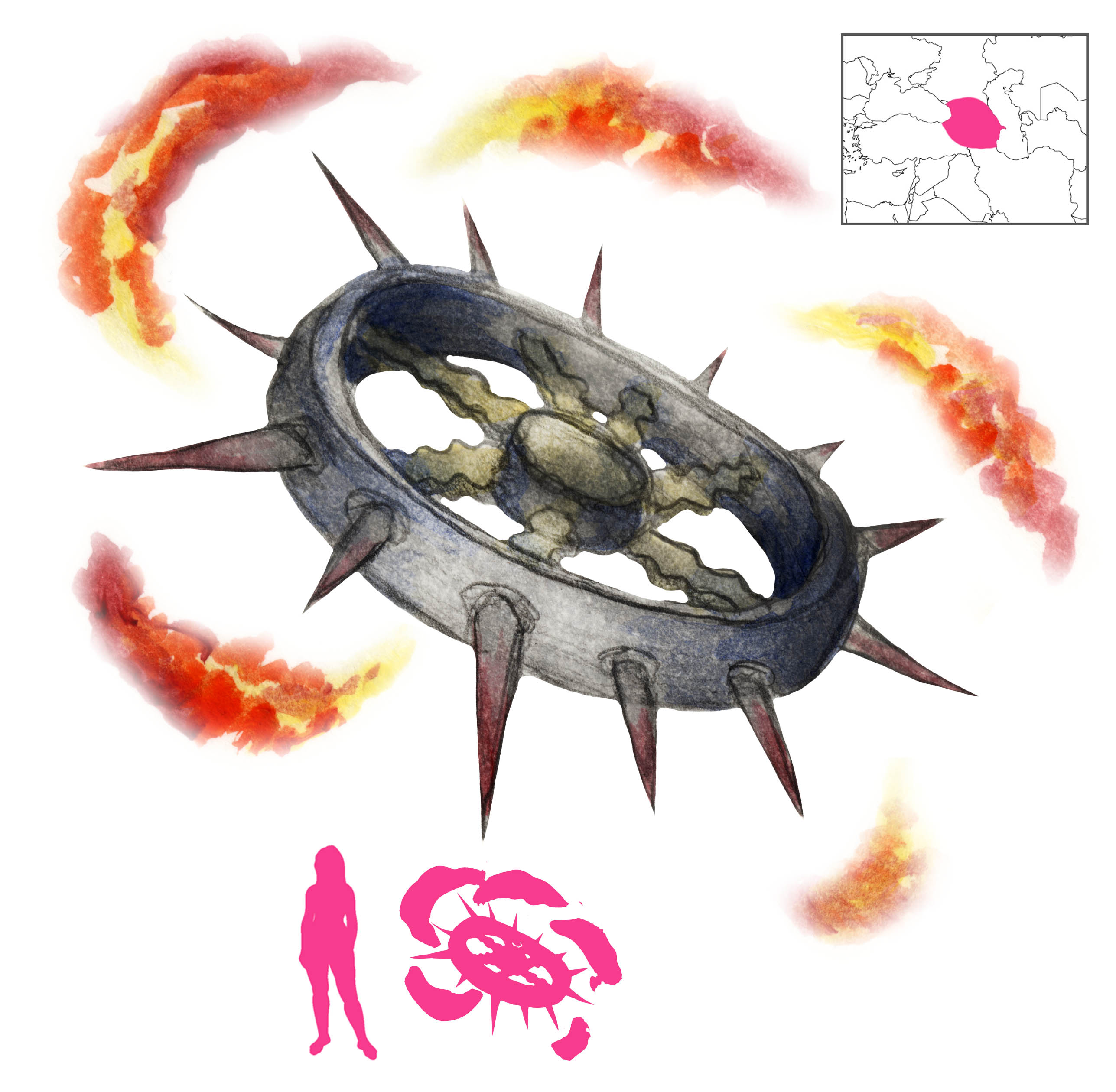 Once the horse fell, Syrdon called upon the enigmatic Barcädžy Calh, the Wheel of Balsæg or Cutting Wheel. The Wheel was a Thinking Machine, an intelligent and malevolent automaton that took the form of a razor-sharp metal wheel with steel teeth and flames bursting from it. It came rolling down from the heavens to the Earth, setting fire to plains and forests as it went on its headlong charge to the Black Sea. Only birch trees managed to avoid the flaming Wheel’s wrath. Soslan gave chase to it and captured it, but it escaped his grasp, flew at him, and sliced through his knees, leaving him for dead. The hero’s sons chased the Wheel back into the Black Sea, but it was already too late. The Narts buried him as he died; his last act from the grave was the impalement of Syrdon. Soslan’s nephew avenged him by breaking the Wheel in half.