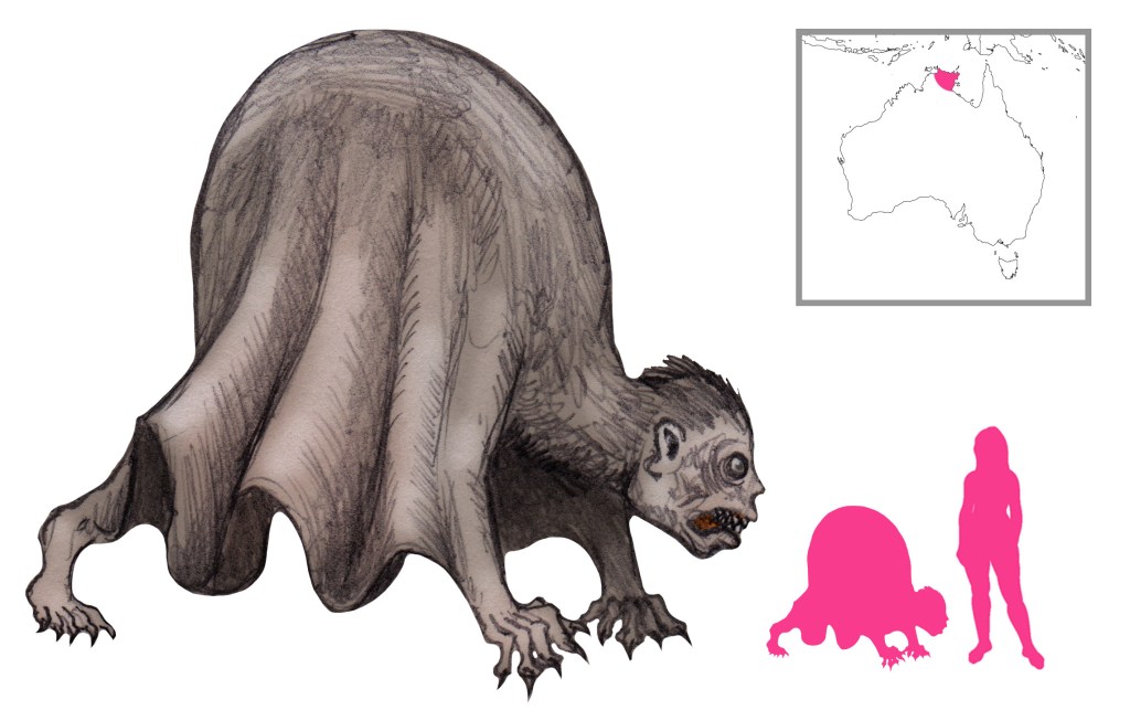 Garkain is a spirit found living alone in the tropical forests of Arnhem Land near the Liverpool River’s mouth. Human in appearance, he possesses great flaps of skin on his arms and legs, like wings or fins, that allow him to fly.