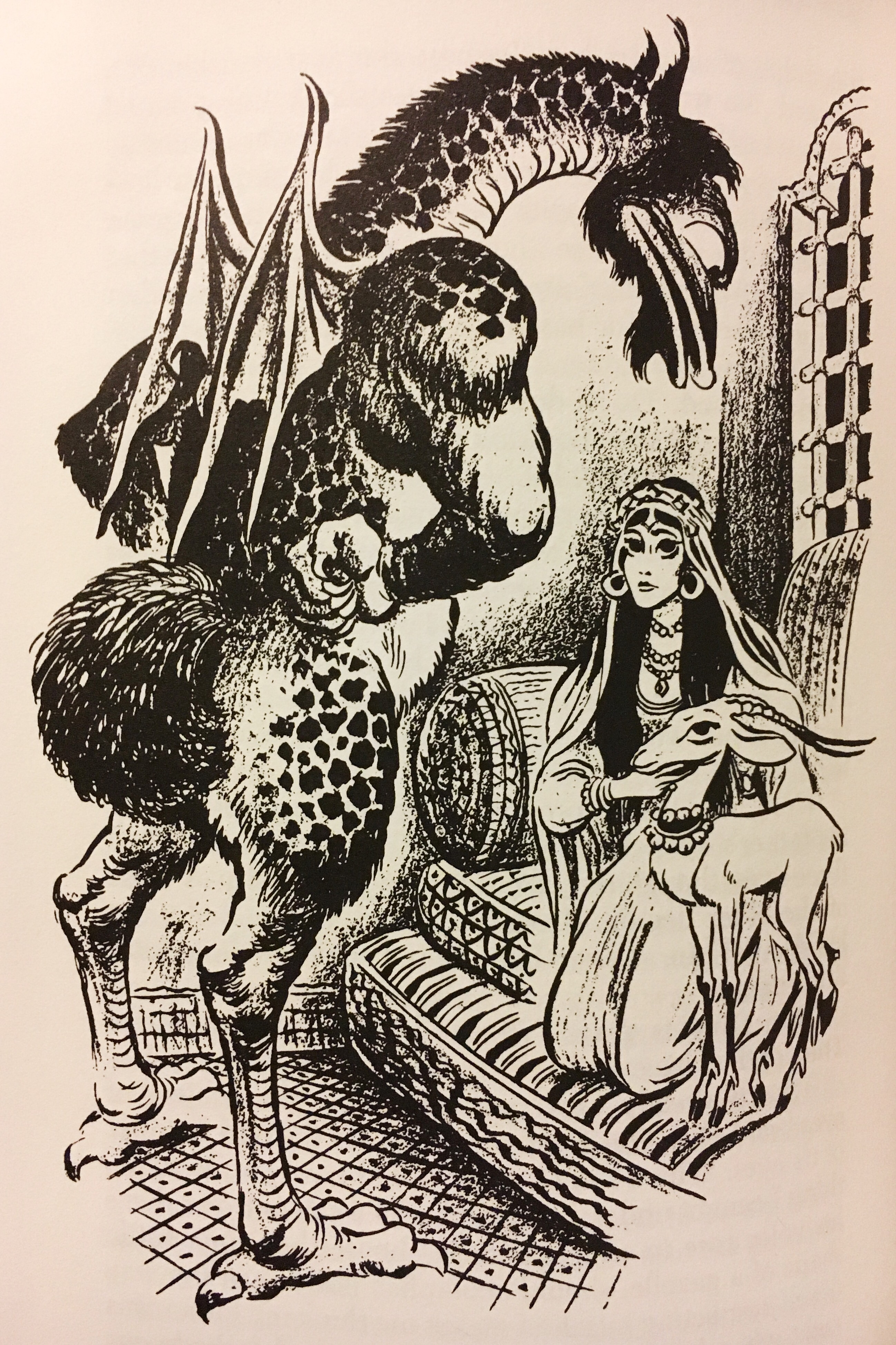She had a very short body, and very long legs made like an elephant’s, so that in lying down she kneeled with both pairs. Her tail, which dragged on the floor behind her, was twice as long and quite as thick as her body. Her head was something between that of a polar bear and a snake. Her eyes were dark green, with a yellow light in them. Her under teeth came up like a fringe of icicles, only very white, outside of her upper lip. Her throat looked as if the hair had been plucked off. It showed a skin white and smooth.