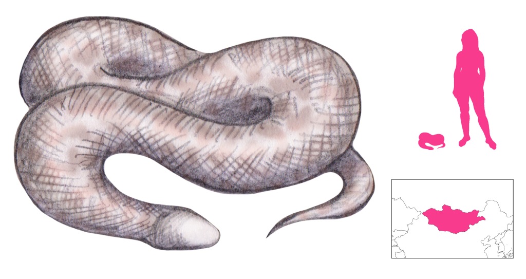 Variations: Olgoi khorkhoi, Olgoj chorchoj, Allergorhai-horhai, Allergorhai horhai, Allghoi khorkhoi, Temen-Sul-Khorkhoi, Temeen Suul (Mongolian name of Tartar sand boa), Intestine Worm, Mongolian Death Worm, Tartar Sand Boa, Eryx tataricus