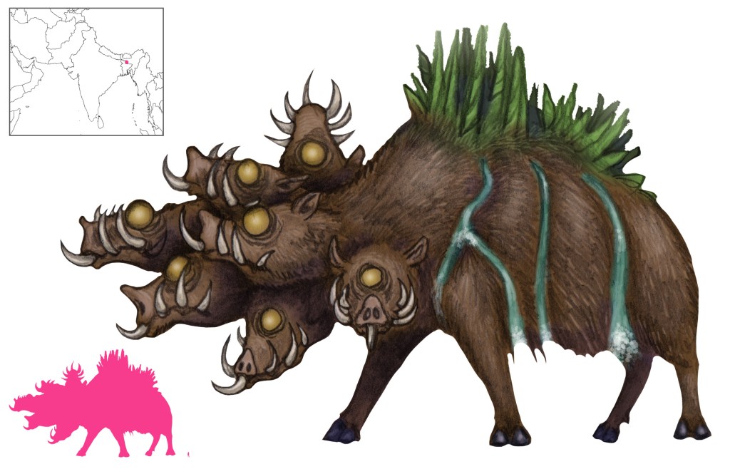 The mere mention of Wakmangganchi Aragondi was enough to strike fear into the bravest warrior – and with good reason. The colossal boar was the biggest and mightiest creature in the world, as tall as a mountain. When standing up, Wakmangganchi Aragondi’s snout touched the Dura Hill, while its tail lay in the Songdu River. It had seven heads emerging from its neck, each head with seven tusks like double-edged scimitars, and each head with a single piercing eye in its forehead glowing like the full moon. On Wakmangganchi Aragondi’s back grew seven clumps of bamboo, seven plots of thatch grass, and seven stalks of bulrushes. Seven perennial streams flowed down its back. The microcosm on Wakmangganchi Aragondi’s back was home to a pair of langurs and their offspring, and seven pairs of moles.