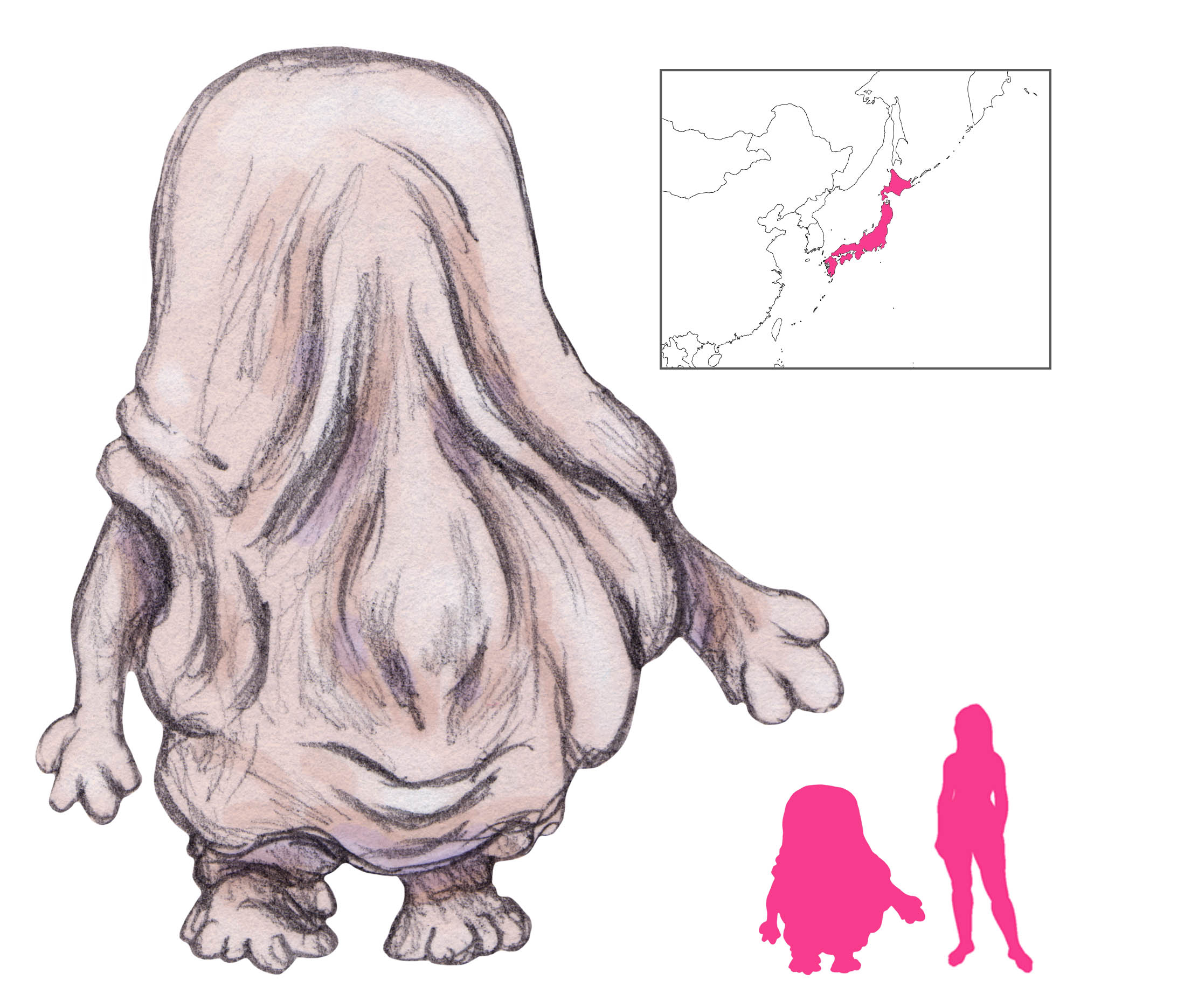 Sekien’s illustration shows a sinuous sluglike creature with humanoid arms emerging from a large horned turban shell. The head is a spiky shell with protruding eyeballs, and seaweed is draped around the neck.