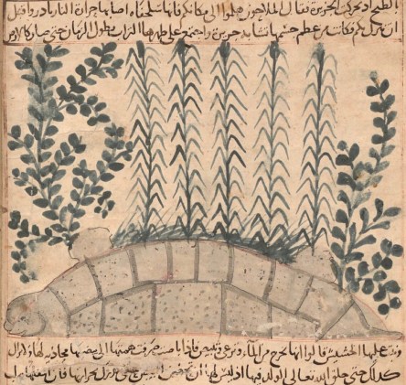 Al-Qazwini’s description of the sea turtle – not a distinct monster per se, just “sea turtles are huge and have vegetation on their backs and look like islands and people land on them”.